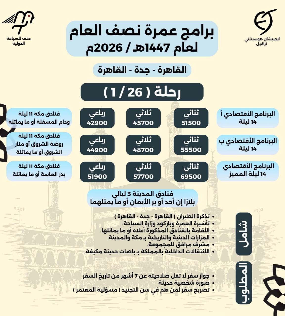 تقدم منف للسياحة الدولية خدمات تنظيم رحلات العمرة والحج وفق أعلى معايير التنظيم والالتزام، لنمنح عملاءنا تجربة روحانية متكاملة يسودها الاطمئنان والراحة منذ لحظة الحجز وحتى العودة بسلام.